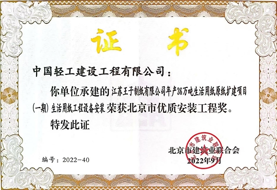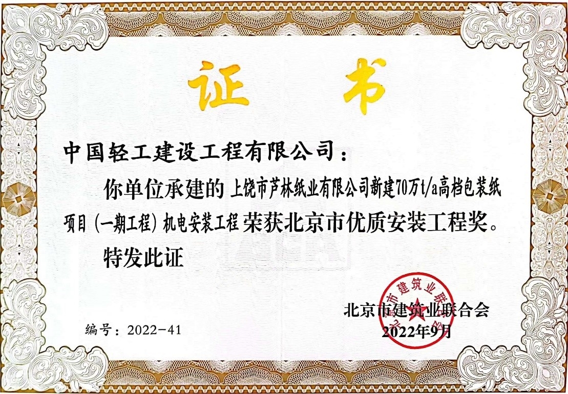 近期,北京市建筑业联合会发布“关于公布2022-2023年度(第一批)北京市优质安装工程奖评选结果的通知”(京建联[2022]71号),mansion88主页中轻建设承建的“上饶市芦林纸业有限公司新建70万t/a高档包装纸项目(一期工程)机电安装工程”和“江苏王子制纸有限公司年产36万吨生活用纸原纸扩建项目(一期)生活用纸工程”荣获北京市优质安装工程奖。