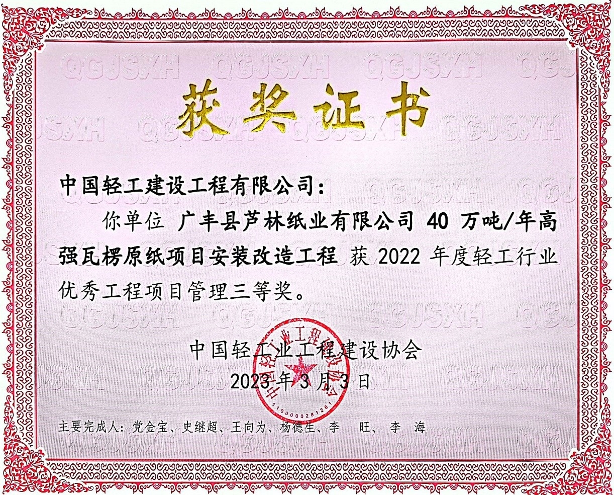 近期,中国轻工业工程建设协会发布“2022年度轻工行业优秀项目管理和工程总承包评价结果公告”(中轻建协[2023] 10号),mansion88主页所属中国轻工建设工程有限公司(以下简称中轻建设)承建的“广丰县芦林纸业有限公司40万吨/年高强瓦楞原纸项目安装改造工程”经评审专家的严格评审,在众多参选项目中脱颖而出,荣获三等奖。