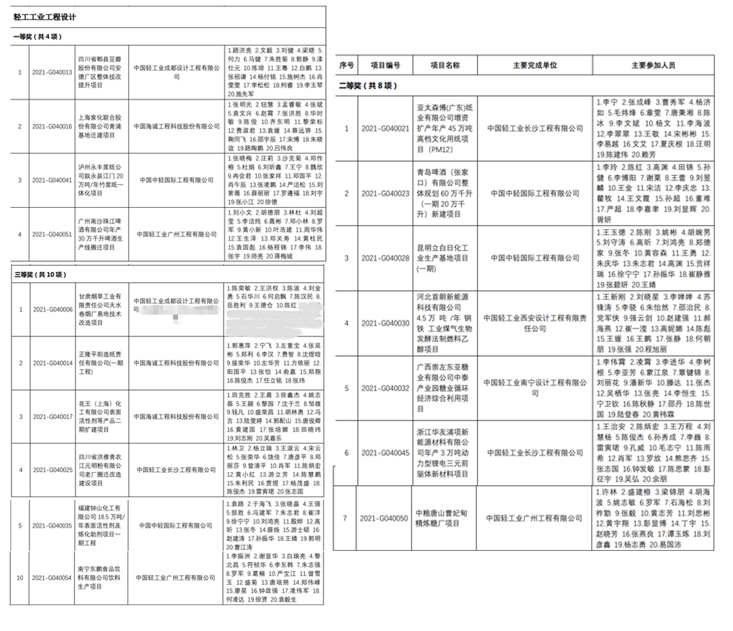 近期,中国勘察设计协会公布2021年度工程勘察、建筑设计行业和市用公用工程优秀勘察设计奖,在轻工业工程设计一栏(共22个奖项),mansion88主页及所属单位作为项目主要完成单位包揽一等奖4项、二等奖7项、三等奖6项。