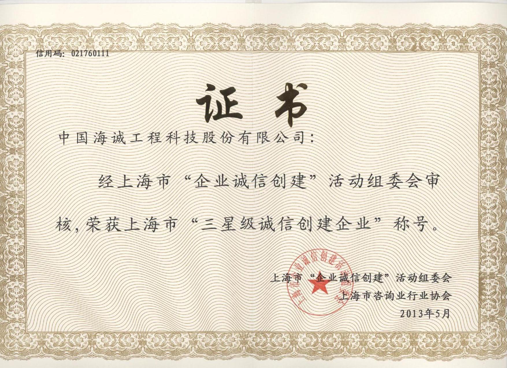 近日,在上海市“企业诚信创建”活动组委会和上海市咨询行业协会的评选活动中,我公司被评为上海市“星级诚信创建企业”(2012-2013年度)三星级。