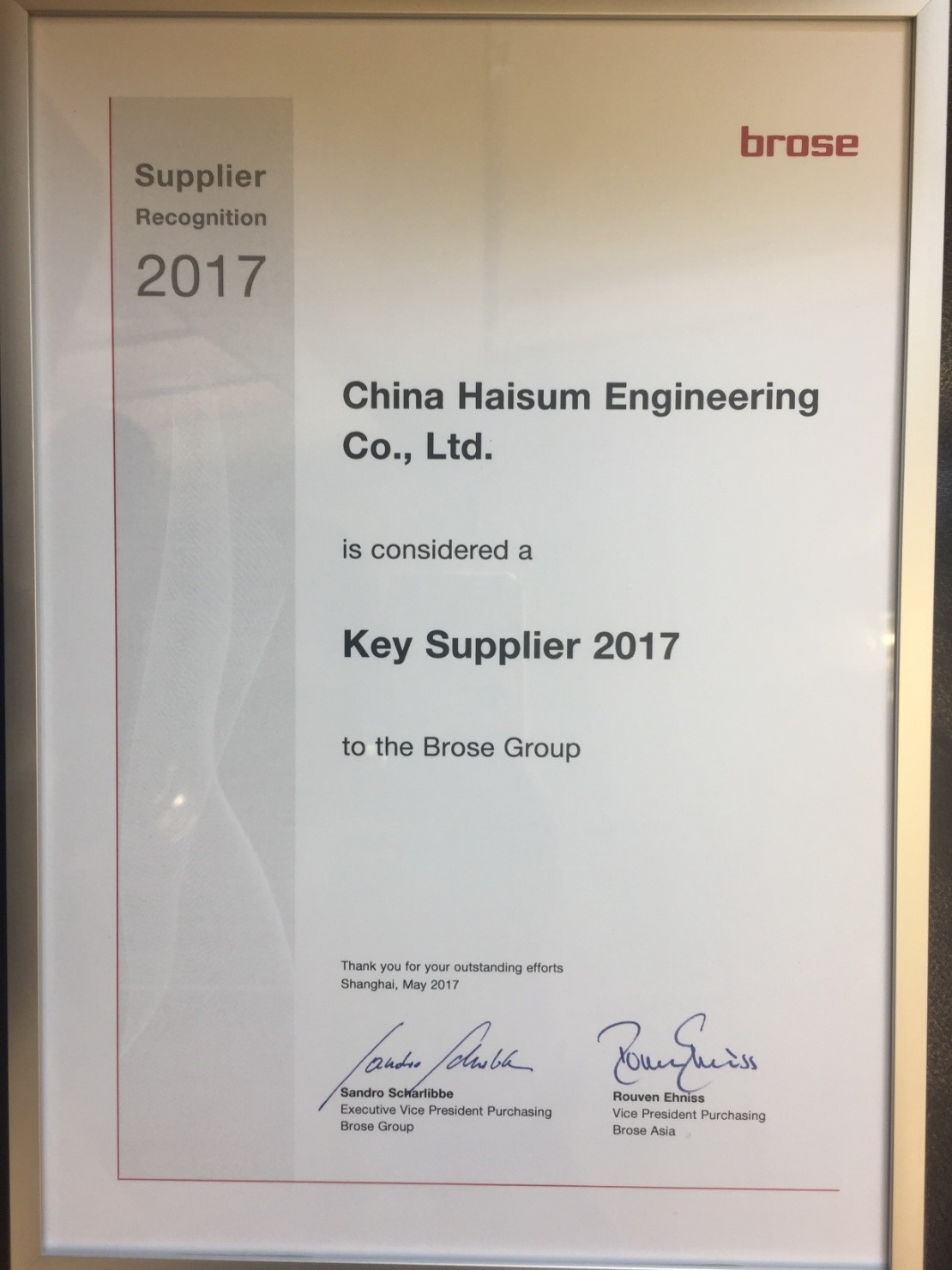 日前,为感谢公司对博泽公司的贡献,博泽集团授予海诚“2017核心供应商”的称号。