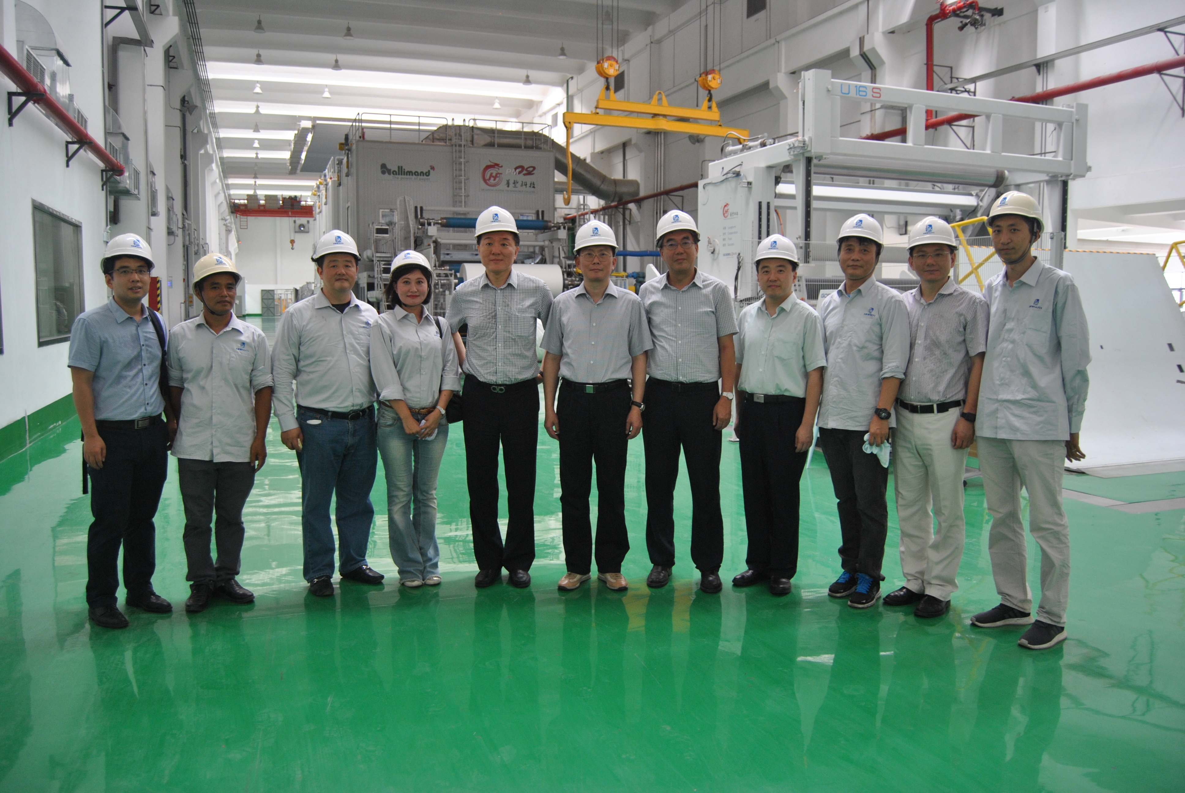 座谈会后,经信委领导代表系统工会向公司工会发放了高温慰问款,并向现场员工发放了高温慰问品,随后还在项目经理刘向一的带领下实地参观了生产车间。车间内机器轰鸣,热浪滚滚,但整体干净整洁,材料堆放整齐,由公司负责安装的两台进口特种纸机更是给大家留下了深刻印象。