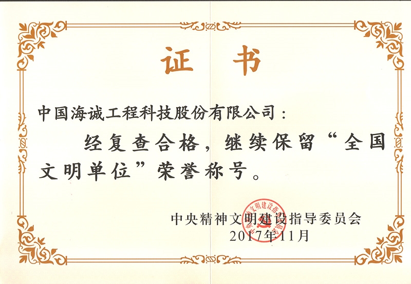 近两年来,公司在成功获评第四届全国文明单位的基础上,坚持党建引领文明创建,巩固深化文明创建成果。复查工作启动后,公司党委高度重视,充实了公司精神文明领导小组和工作小组,并严格按照中央文明委2017年全国文明单位测评体系要求,持续深入开展文明创建活动,组织保障有力、基础管理扎实、创建载体丰富、特色亮点突出,营造了浓厚的文明建设氛围,持续保持了全国文明单位的良好形象。