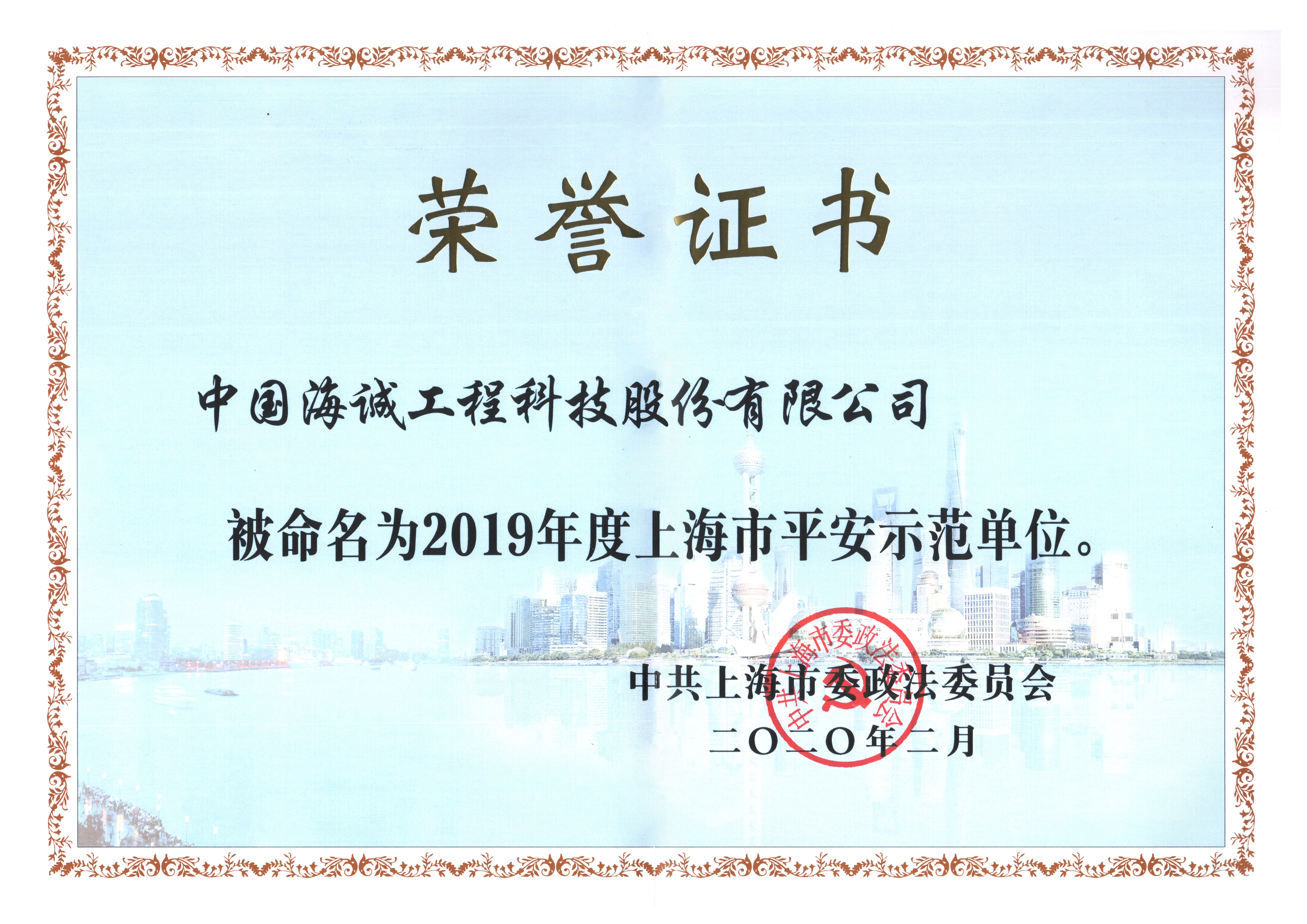 日前,公司被中共上海市委政法委员会授予2019年度上海市“平安示范单位”荣誉称号。该奖项旨在表彰企业为推进安全保卫工作,提升平安创建水平,牢固树立安全责任意识,积极营造安全稳定的社会环境所做出的贡献。