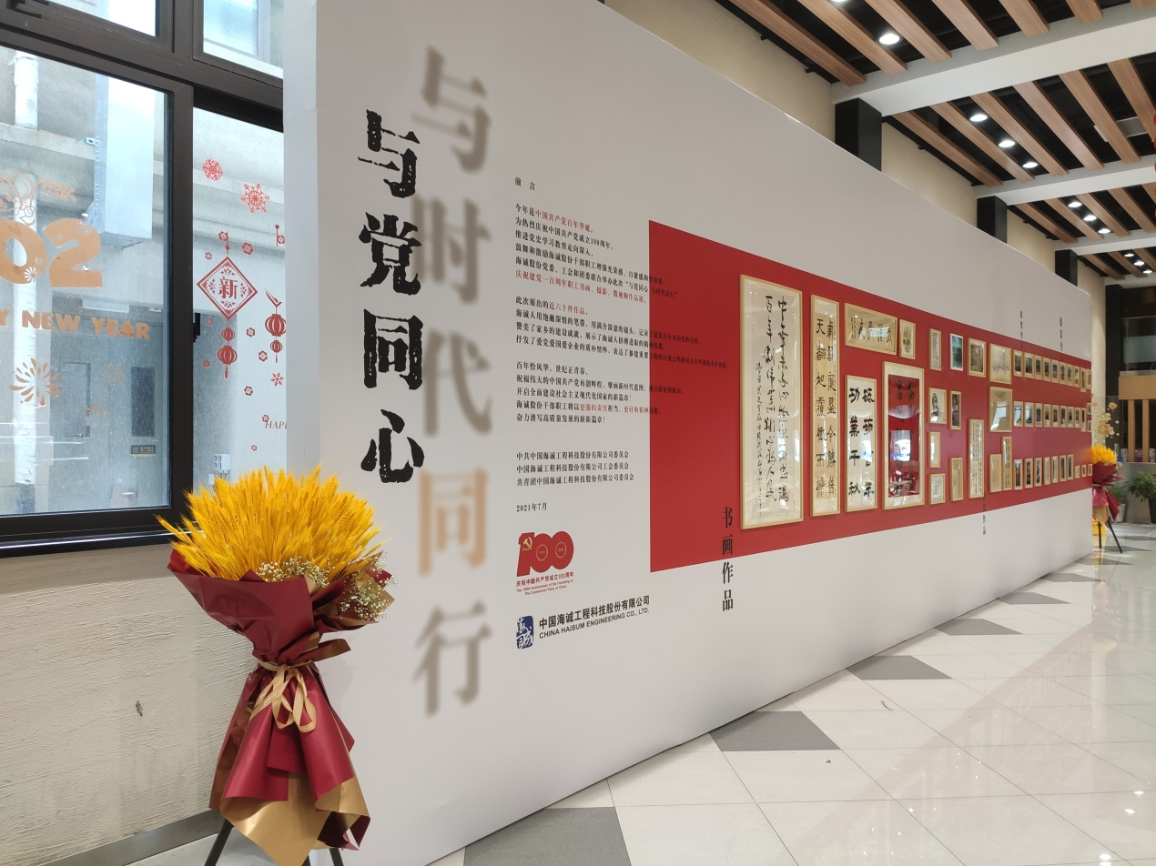 此次展出的近六十件作品均由海诚股份、本部及各子公司职工创作。作品主题鲜明,形式多样,通过饱蘸深情的笔墨和满含深意的镜头全方位、多角度记录建党百年来的光辉历程,赞美家乡的建设成就。展品融思想性、艺术性和感染力于一体,展示了海诚人拼搏进取的精神风貌,抒发了爱党爱国爱企业的质朴情怀,表达了参建重要工程的自豪之情和对百年华诞的美好祝愿。