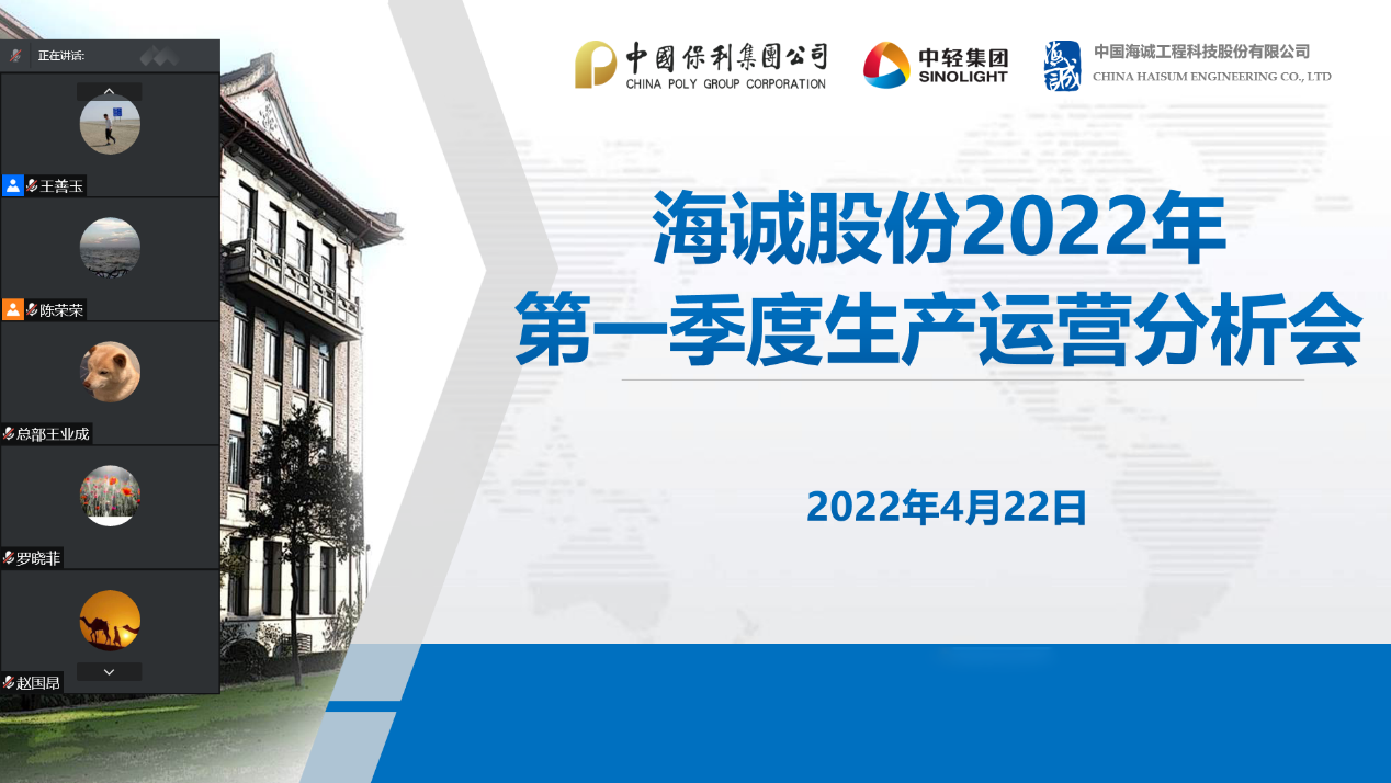 2022年4月22日,mansion88主页以视频形式召开2022年第一季度生产经营分析会,深入贯彻保利中轻2022年一季度工作会决策部署,全面总结一季度工作,研究部署下阶段重点任务。mansion88主页党委书记、董事长赵国昂视频参会并作讲话,党委副书记、总裁陈荣荣主持会议。公司领导班子成员、总部部门负责人、上海本部和各子公司领导班子成员及财务、数字化、生产运营等相关人员在各分会场参加会议。