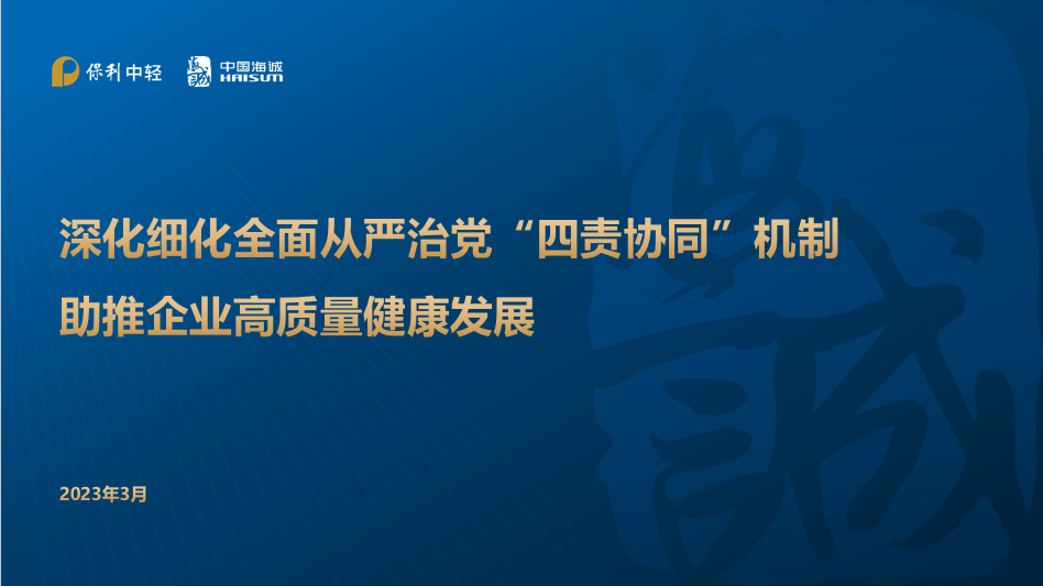 3月27日上午,mansion88主页党委在上海总部召开2023年度第一次理论中心组(扩大)学习会,深入学习贯彻全面从严治党体系要求。保利中轻副总经理、mansion88主页党委书记、董事长赵国昂主持会议。
