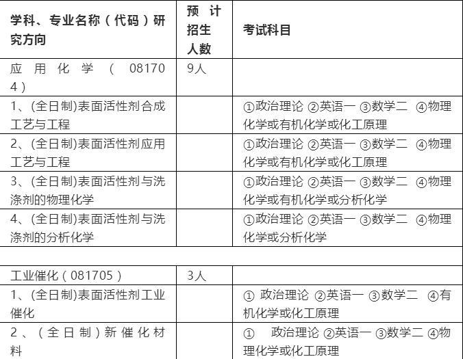 2020年面向全国招生,招生专业为:应用化学和工业催化,均为全日制。凡符合国家研究生招生简章规定报考条件的考生,均可报考我院。被我院录取的研究生,在攻读学位期间可以享受我院提供的助学金,学习成绩优秀的硕士研究生可以获得各类奖学金。一年级在山东大学胶体与界面化学教育部重点实验室学习基础理论课,二、三年级在日化院完成学位论文,其间在受到严格科研训练的同时,还能参与到我院承担的国家和地方各类研究项目中。毕业后面向全国就业,成绩优秀者可留院工作。我院历届毕业硕士研究生受到了全国日化及表面活性剂相关行业的欢迎,也得到其他与化学化工相关企业、科研院所及高等院校的高度认可。