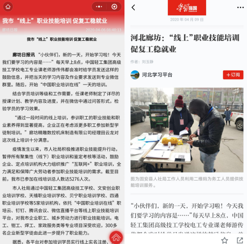 △“学习强国”河北学习平台和《廊坊日报》分别对中国轻工集团高级技工学校 “开展企业新型学徒制线上教学,助力复工复产、稳就业”的情况进行了相关报道