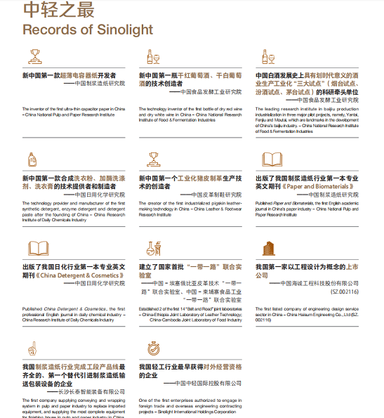 中轻集团作为国家第四批创新型试点企业,拥有轻工相关行业贯通科研、设计、智造等完整产业链的综合集成服务能力,是我国轻工行业科技进步和行业转型升级的引领者,始终发挥着国有企业在轻工行业的控制力、影响力和带动力。