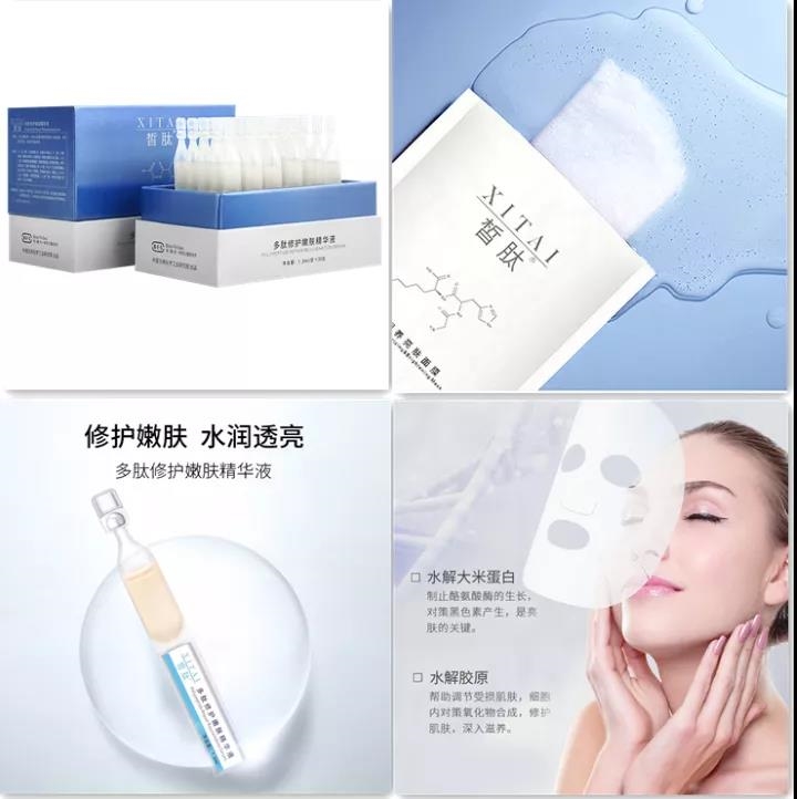 多肽修护嫩肤精华液和多肽修护面膜以保利中轻自有专利技术提取的海洋胶原三肽、大米三肽为核心原料,具有美白、嫩肤、修护等功效