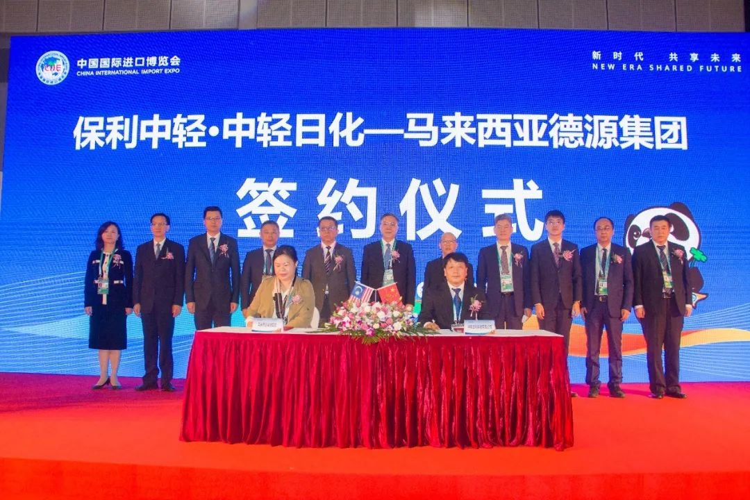 11月7日下午,在第四届中国国际进口博览会上,保利中轻所属中轻日化科技有限公司(以下简称中轻日化)与马来西亚德源集团(以下简称德源集团)签署采购协议。保利集团党委常委、副总经理张曦,保利中轻总经济师赵国昂,保利集团战投中心副主任杜鹏,中轻日化董事长耿涛、总经理封益民出席签约仪式。