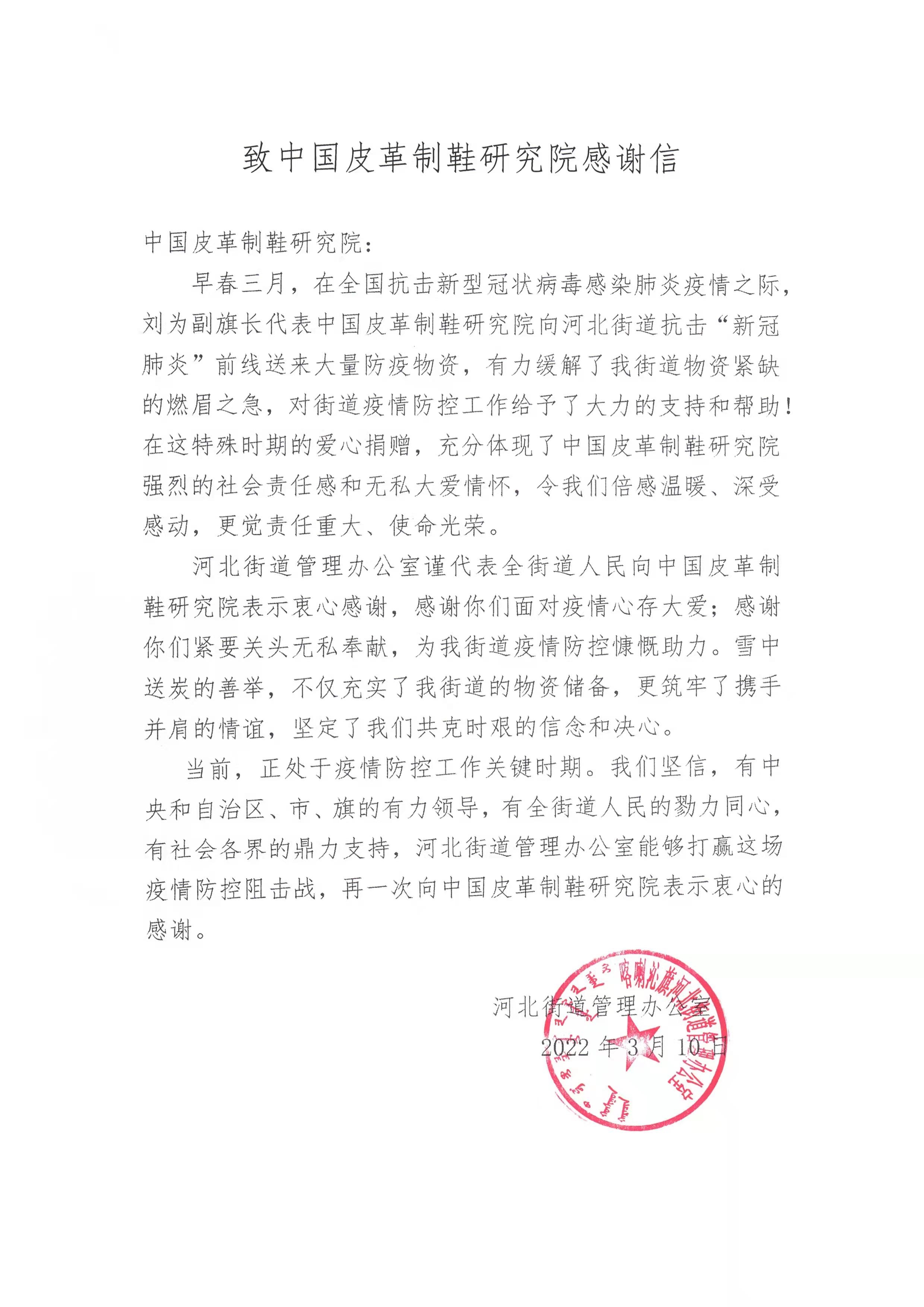 为助力内蒙古喀喇沁旗渡过疫情难关,中国皮革制鞋研究院向喀喇沁旗河北街道捐赠了400套防护服,并收到河北街道发来的感谢信。