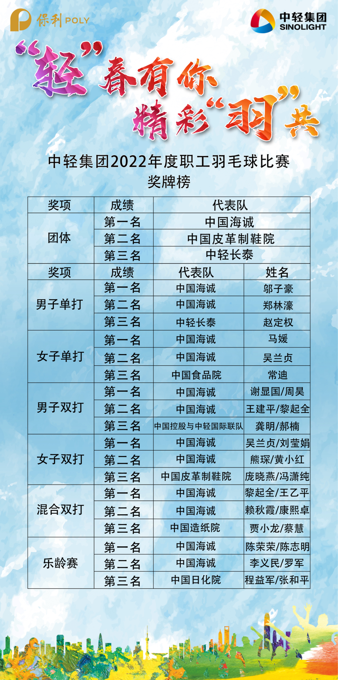 8月18日下午4点,中轻集团举行2022年度职工羽毛球比赛闭幕式暨颁奖仪式,为赢得比赛的个人与团体颁奖。经过两天激烈角逐,本届羽毛球比赛奖牌榜已经诞生!