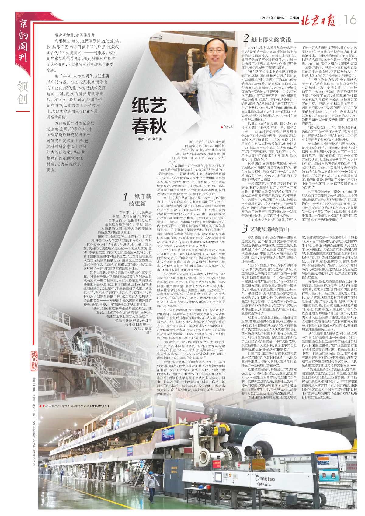 2023年3月16日,《北京日报》“京韵周刊·领创”专栏以《纸艺春秋》为题,刊发保利中轻所属中国制浆造纸研究院研究开发部副主任、包装研发中心主任张红杰及其团队,为打破国外对制浆造纸助剂的垄断,持续研发植物纤维基绿色环保材料,助力绘就绿水青山的故事。与大家分享——