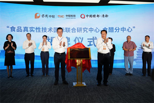 在与会领导和嘉宾共同见证下,太原市人大常委会副主任、清徐县委书记王剑峰与中轻检验总经理赵红峰共同为“食品真实性(FA)技术国际联合研究中心——食醋分中心”揭牌。