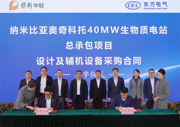 保利中轻副总经理、mansion88主页董事长赵国昂与东方国际副总经理周杰代表双方签署战略合作协议。mansion88主页副总裁罗军与东方国际机电事业部总经理杜晓东代表双方签署纳米比亚奥奇科托40MW生物质电站总承包项目设计及辅机设备采购合同。签约仪式前,双方就深化合作深入友好交流。