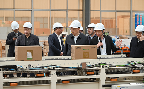 张剑飞一行深入生产车间,实地考察企业生产经营情况。屈辉现详细汇报企业发展历程、主营业务、创新研发成果、核心竞争力及未来发展规划,并现场演示纸箱件智能装车系统测试运行。