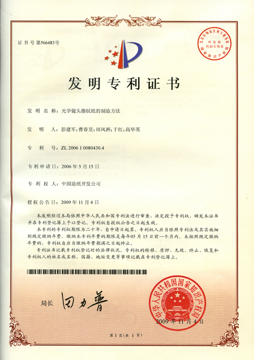 由中国制浆造纸研究院申请的两项发明专利“光学镜头擦拭纸的制造方法”和“全热空气换热器纸芯用隔离纸的制造技术”于