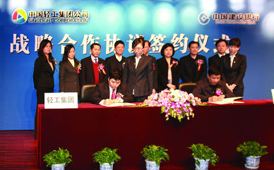 2月1日,中国轻工集团公司与中国建设银行股份有限公司北京市分行50亿元战略合作协议签约仪式在北京隆重举行,集团公司总经理陈鄂生、建行北京分行行长王军分别代表各自企业出席仪式并签署了战略合作协议。双方还将在资金结算、资金管理平台、财务顾问服务以及其他金融服务等方面深化合作,这标志着双方的合作将迈上更高的台阶。集团公司副总经理俞海星、集团公司总会计师郭建全以及建行北京分行副行长龚毅、宣武支行行长刘发猛出席签约仪式。