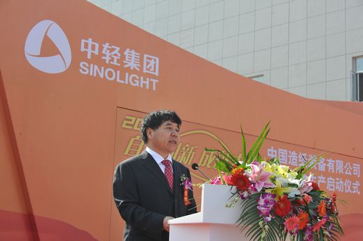 陈鄂生董事长代表中轻集团致辞。他向出席启动仪式的各位领导、各位专家、全国的优秀企业家们表示热烈的欢迎和衷心的感谢。他指出,永清基地的生产启动,为集团公司装备板块实现跨越式发展打下了坚实的基础,成为集团打造新的产业价值链的关键一环。中国造纸装备有限公司要紧紧抓住国家振兴装备制造业的关键机遇,凭借在造纸领域的科研、咨询设计、总承包、工程化推广及实施能力,整合国内外优质资源,突破造纸装备关键技术瓶颈,实现集成创新,为造纸企业提供具有性价比优势的先进成套装备和优质服务,担当起振兴民族造纸装备工业的历史使命。他预祝造纸装备自主化集成(永清)基地的生产启动取得圆满成功!