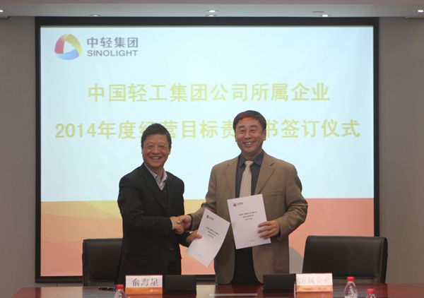 集团公司总经理俞海星与中轻对外公司副总经理马江(代)签订经营目标责任书