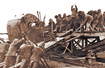 大会战时期,王进喜(中)和钻井工人们人拉肩扛运钻机,保障钻井作业。(资料图片)